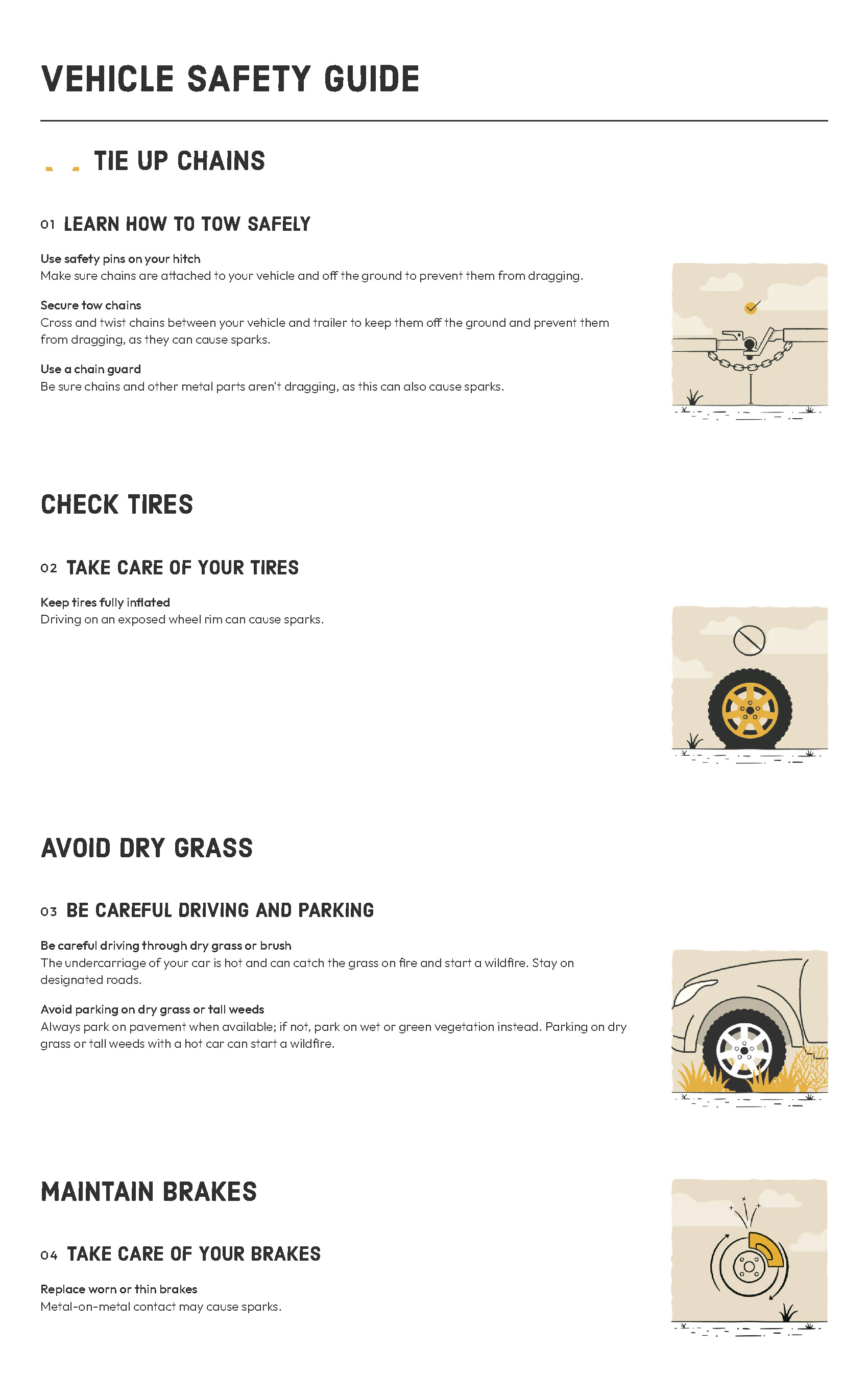 Cross and twist chains between your vehicle and trailer to keep them off the ground and prevent them from dragging, as they can cause sparks.